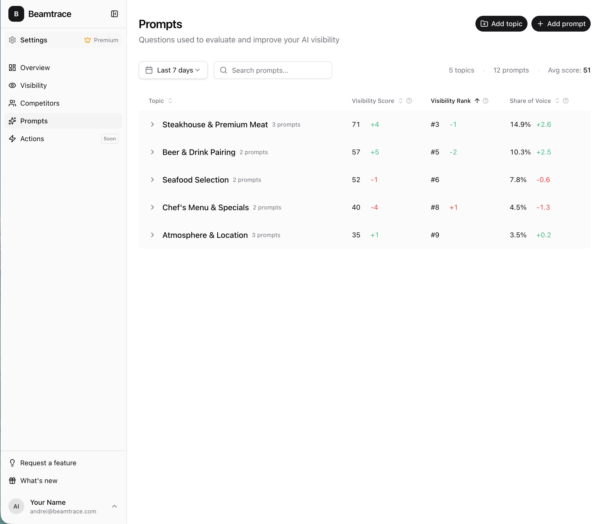 Beamtrace tracks visibility, rankings, mentions, sentiment, and citations across all AI platforms.
