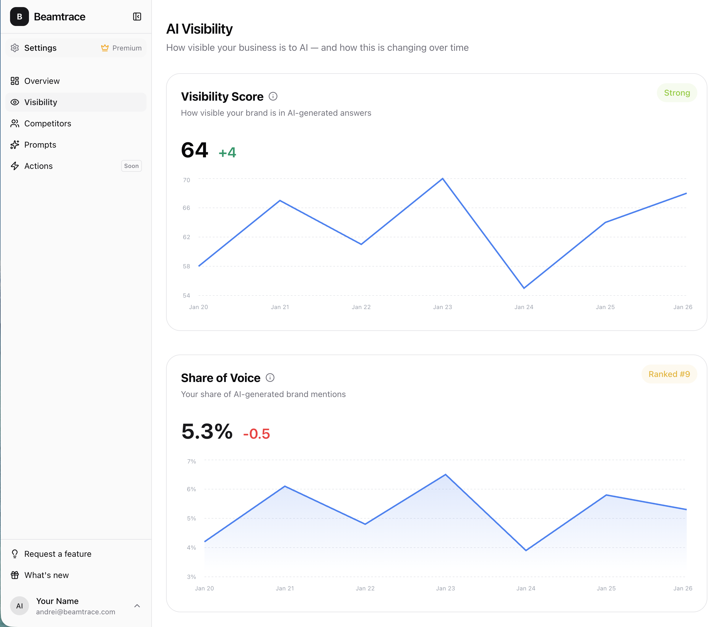 Beamtrace tracks Visibility Score, mention frequency, average position, sentiment, competitive context (who else AI mentions alongside you), and citation sources (which web pages AI relies on).